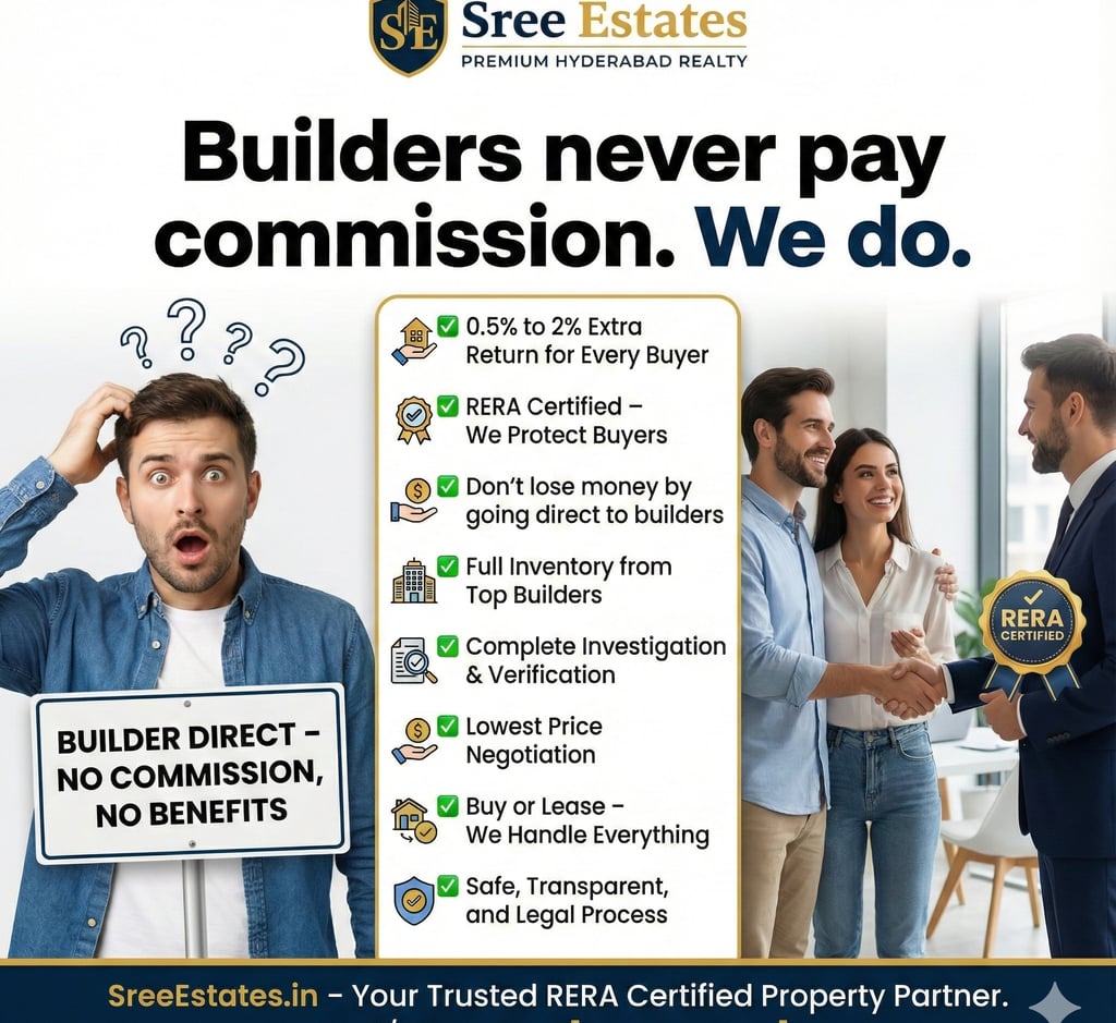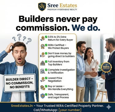 At sreeestates, we turn your property dreams into rewarding realities with cashback and commission sharing on flats, villas, plots, and commercial spaces.